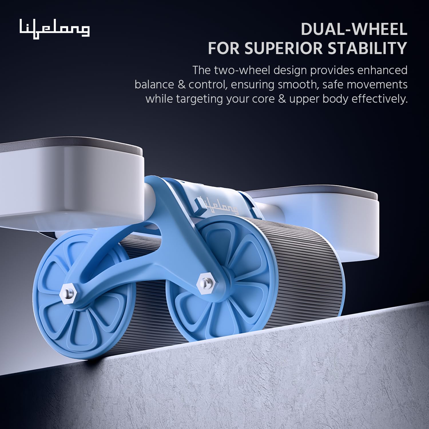 The AB Roller has a broadened two-wheel design that lengthens the wheelbase and widens the ground contact area, which significantly lessens lateral sway and improves stability when performing exercises.